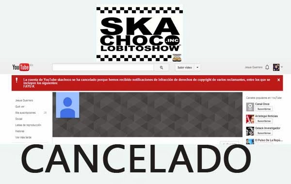 Cancelan Canal de Youtube de Skachoco by Redaccion enero 14, 2014 Redaccion 0 Shares 0 Cancelan Canal de Youtube de Skachoco Lobitoshow.inc por de derechos de copyright de varios reclamantes entre los los Denunciantes para el Cierre del Canal estas varias Bandas de Ska en MeXico SkAlicia Preventa Este Jueves 16 de Enero 2014 Previous Article Alika en Dobermann Centro Sabado 25 de Enero Next Article