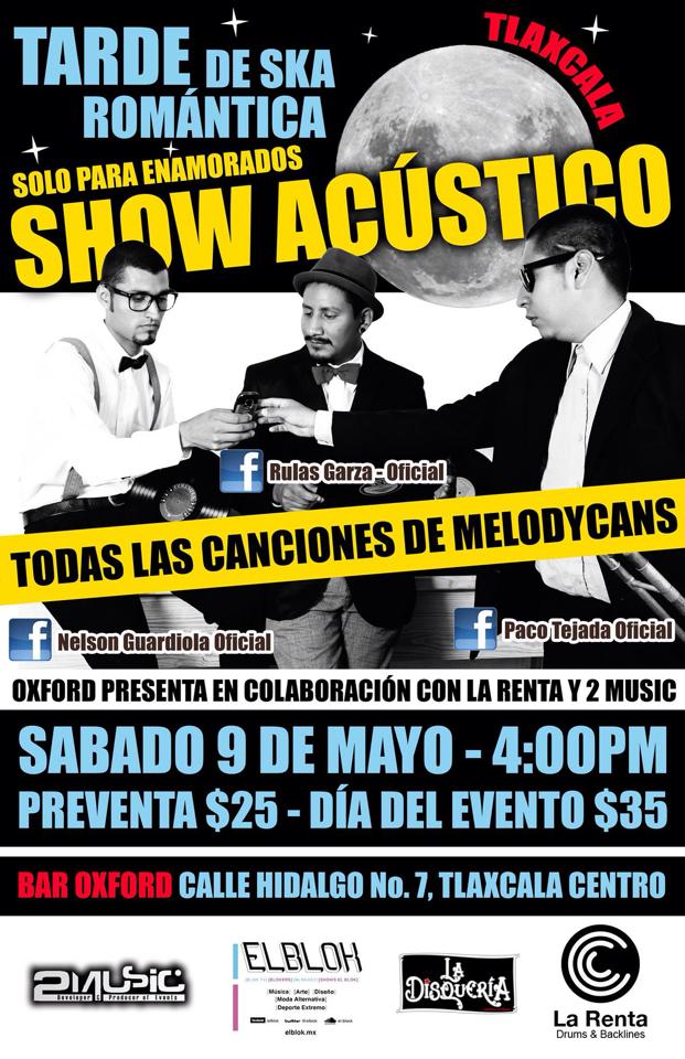 Los Melodycans en Acustico en Bar Oxford Sábado 09 de Mayo 2015 by Redaccion mayo 3, 2015 Redaccion 0 Shares 0 Hora : 04:00 Pm Cover : Pre: $25 /// Día : $35 Tags Tlaxcala Maskatesta en Pulque para dos Sábado 30 de Mayo 2015 Previous Article El que no conoce el Alicia, no conoce el Ska Next Article