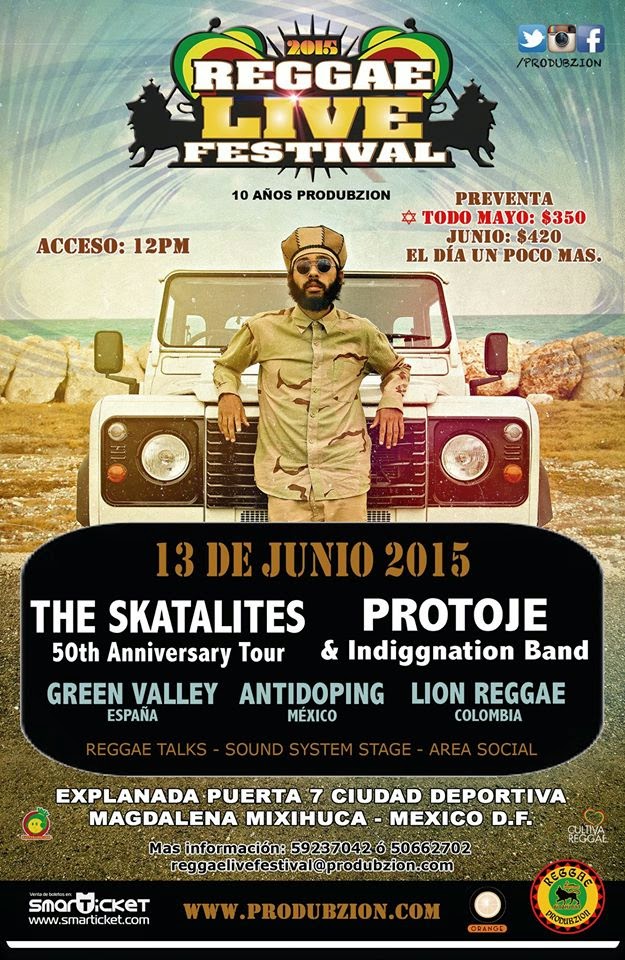 The Skatalites, Lion Reggae, Antidoping, Protoje y Green Valley serán los encargados de poner a bailar a todo el Distrito Federal el próximo 13 de junio en Ciudad Deportiva de la Magdalena Mixhuca, Puerta 7 muy cerca del Metro Puebla podrás ser parte de la fiesta más grande del Reggae pues los colores rojo, verde y amarillo invadieron el norte de la ciudad.