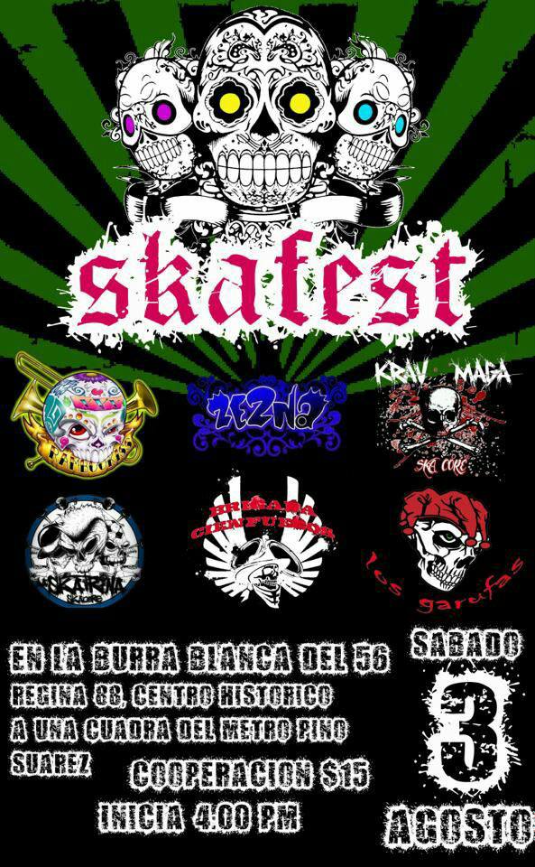 SkaFest en La Burra Blanca Sabado 03 de Agosto by Redaccion julio 31, 2013 Redaccion 0 Shares 0 Hora:04:00 PM Cover:$15Bandas: Rambookiss LOS GARUFAS y Mas La Caverna Rock & Bar Presenta Los Rastrillos Viernes 16 de Agosto Previous Article Kaifanes Mezcal Rock Presenta La Milicia Mlc Viernes 30 de Agosto Next Article