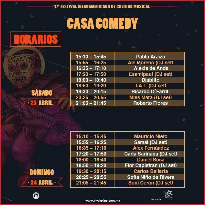 Vive Latino 2016 – Horarios Casa Comedy by Redaccion marzo 30, 2016 Redaccion 0 Shares 0 La Carpa Casa Comedy es la primera carpa rotante de Stand Up Comedy y DJ´s en nuestro país. Los DJ´s confirmados de la Carpa Comedy son: Ale Moreno (DJ) – Disco Ruido Carla Sariñana (DJ) Esamipau! (DJ) Flor Capistran (DJ) Miss Mara (DJ) Samsi (DJ) Soni Cerón (DJ) T.A.T (DJ) Tags Vive Latino 2016 Prende los radios transitores que llegará Expo Vintage Fest Previous Article Pedaleará el Triciclo Circus Band en Carpa Astros Next Article